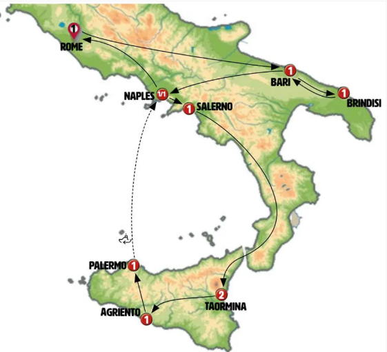 We'll journey to the south of the boot, marveling at the stunning southern Italian scenery as we cross the Cilento National Park. We'll arrive in Paola, located on the shores of the Tyrrhenian Sea, where we'll visit the Sanctuary of St. Francis of Paola and enjoy free time for lunch in its charming historic center. Our adventure will then take us to Villa San Giovanni, where we'll board a short ferry crossing to the island of Sicily. Upon arrival in Messina, we'll have time to stroll around the cathedral. Finally, we'll continue to Taormina. Dinner will be included. Note: Accommodation will normally be in the Taormina region, but on certain dates, lodging may be provided in Messina.
