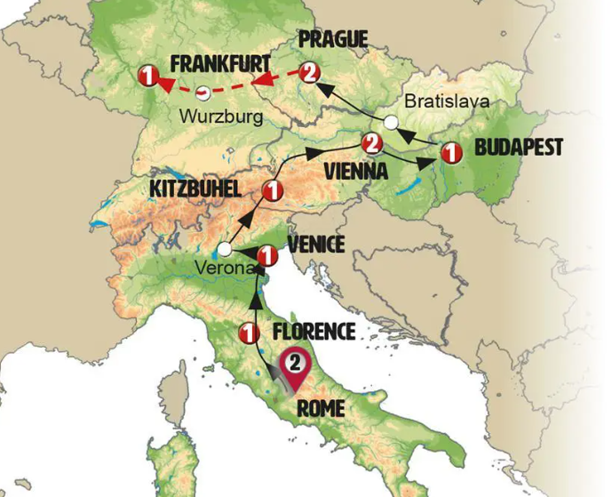 We’ll depart early from PRAGUE and stop in PILSEN, in western Bohemia, a city renowned for its beer. You’ll have time to stroll through its historic center, where you’ll find the Old Town Square, the cathedral, the Plague Column, and a Renaissance-era town hall. We’ll then cross into GERMANY and follow part of the Romantic Road. We’ll visit ROTHENBURG, a town that seems to come straight out of a fairy tale and is considered one of the most beautiful villages in the country. Afterward, we’ll head to FRANKFURT, the financial capital of Germany. After our arrival in the evening, enjoy free time in the historic city center, where you’ll find a wide variety of restaurants offering Indian, Asian, Italian, and international cuisines.